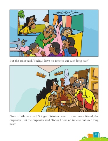 But the tailor said, ‘Today, I have no time to cut such long hair!’ Now a little worried, Sringeri Srinivas went to one more friend, the carpenter. But the carpenter said, ‘Today, I have no time to cut such long hair!’ 65