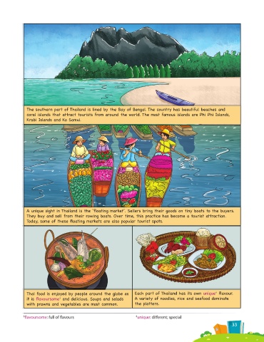 A unique sight in Thailand is the ‘fl oating market’. Sellers bring their goods on tiny boats to the buyers.